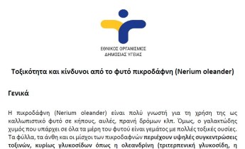 Εθνικός Οργανισμός Δημόσιας Υγείας: «Τοξικότητα και κίνδυνοι από το φυτό πικροδάφνη (Nerium oleander)»