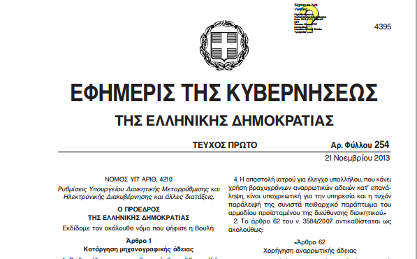 Με το νόμο 4210/13 (ΦΕΚ 254/21.11.2013 τεύχος Α’) Ρυθμίσεις Υπουργείου Διοικητικής Μεταρρύθμισης και Ηλεκτρονικής Διακυβέρνησης και άλλες διατάξεις ψηφίστηκαν νέες αντεργατικές διατάξεις που περικόπτουν δικαιώματα και κατακτήσεις των εργαζομένων.