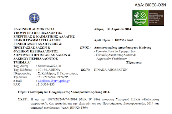 To Υπουργείο Περιβάλλοντος, Ενέργειας και Κλιματικής Αλλαγής θα χρηματοδοτήσει και κατά το τρέχον έτος τις Αποκεντρωμένες ∆ασικές Υπηρεσίες προκειμένου να υλοποιήσουν πρόγραμμα ∆ασοπροστασίας.