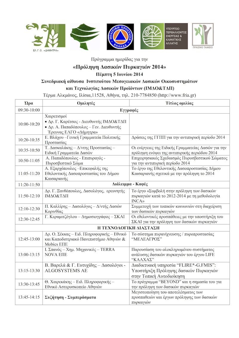 Το Ινστιτούτο Μεσογειακών Δασικών Οικοσυστημάτων και Τεχνολογίας Δασικών Προϊόντων, στα πλαίσια του χρηματοδοτούμενου από το Πράσινο Ταμείο του Υ.ΠΕ.Κ.Α. έργου με τίτλο «Συμβολή στην πρόληψη των δασικών πυρκαγιών κατά το 2012-2014 με τη μεθοδολογία INCA», διοργανώνει ημερίδα με θέμα:
