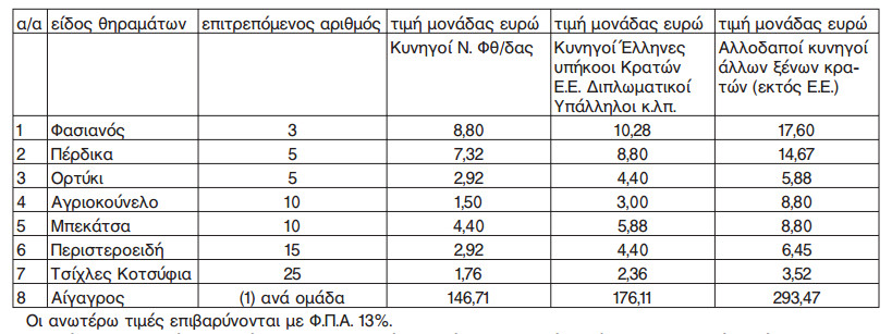 - Δώδεκα (12) Ευρώ (πλέον Φ.Π.Α. 23 %) για τους Έλληνες κυνηγούς που κατοικούν στο Ν. Φθιώτιδας.