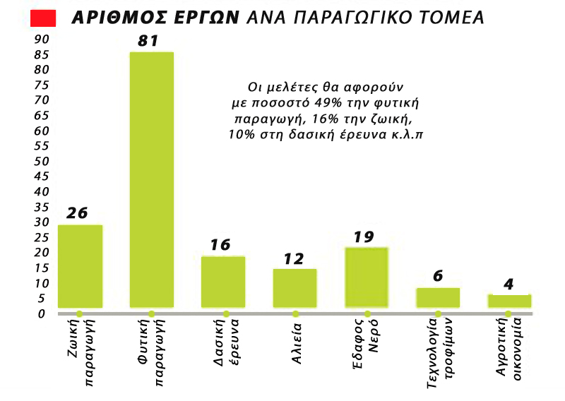 Οι επιστηµονικές αυτές µελέτες θα αφορούν µε ποσοστά 49% στη φυτική και 16% στη ζωϊκή παραγωγή, 7% στην αλιεία, 4% στη τεχνολογία αγροτικών προϊόντων, 12% στη διαχείριση των εδαφουδατικών πόρων, 10% στη δασική έρευνα και 2% στην αγροτική οικονοµία.