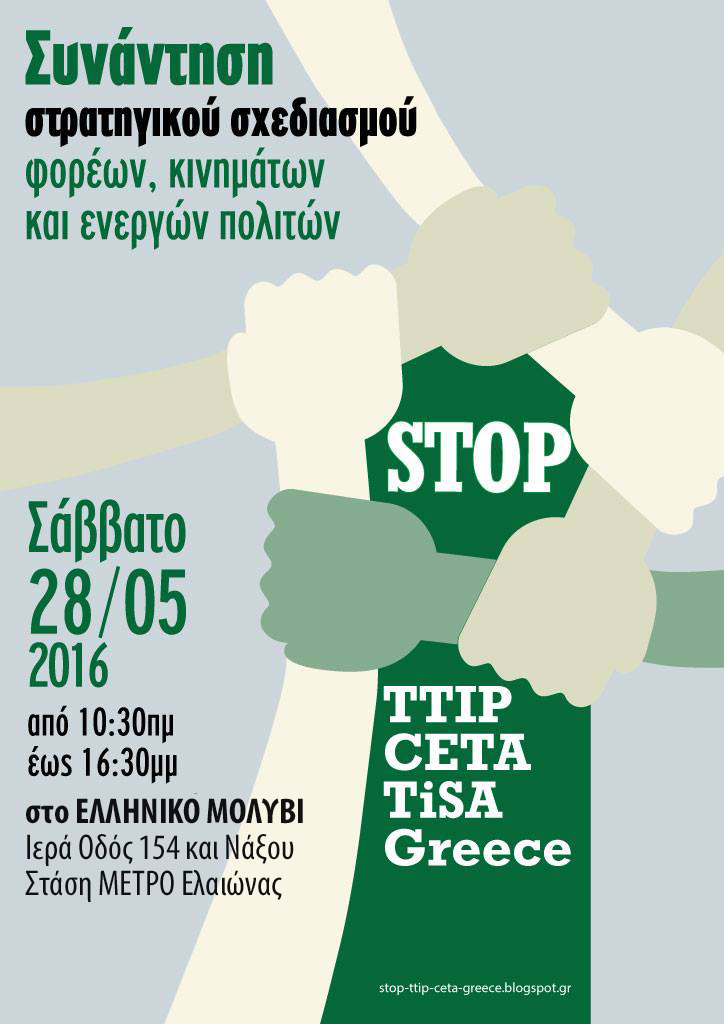 H Ελληνική Πρωτοβουλία STOP TTIP CETA TiSA (Δίκτυο οργανώσεων, συλλογικοτήτων και ενεργών πολιτών) διοργανώνει συνάντηση στρατηγικoύ σχεδιασμού για όσους δραστηριοποιούνται, ενδιαφέρονται και επιθυμούν να αναπτύξουν δράσεις σε τομείς που επηρεάζονται από την TTIP CETA.