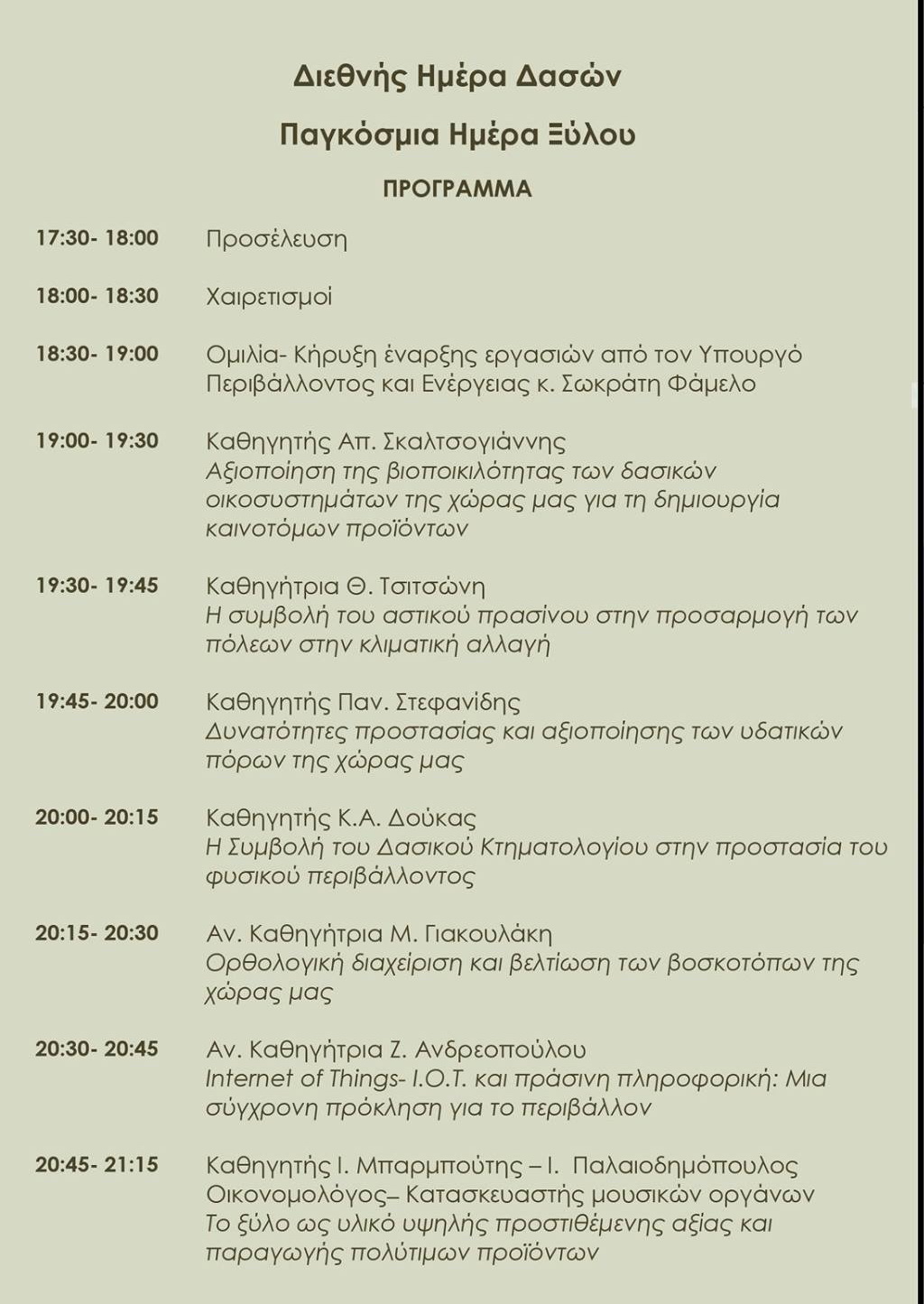 Επετειακή Ημερίδα με θέμα: «Η Συμβολή των Δασών και του Φυσικού Περιβάλλοντος στην αντιμετώπιση της κοινωνικοοικονομικής κρίσης» διοργανώνεται με την ευκαιρία του εορτασμού των 100 χρόνων του Τμήματος Δασολογίας και Φυσικού Περιβάλλοντος και της Διεθνούς Ημέρας Δασών- Παγκόσμιας Ημέρας Ξύλου, την Τρίτη 21 Μαρτίου 2017 και ώρα 17:30 στην αίθουσα Τελετών της Φιλοσοφικής Σχολής Α.Π.Θ.