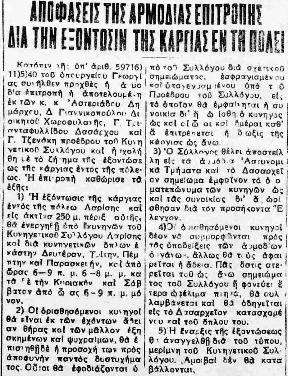 Η «Ε» διαθέτει απόφαση αρμόδιας επιτροπής για την «εξόντωση της κάργιας στην πόλη». Ήταν Μάιος του 1940 όταν στο Υπουργείο Γεωργίας πραγματοποιήθηκε συνεδρίαση της αρμόδιας επιτροπής αποτελούμενη από τον δήμαρχο Λάρισας Αστεριάδη, τον διοικητή της χωροφυλακής Δ. Γιαννικόπουλο, τον δασάρχη Γ. Τριανταφυλλίδη και τον πρόεδρο του Κυνηγετικού Συλλόγου Γ. Τζενάκη για το ζήτημα, όπως ανέφερε η σχετική ανακοίνωση, «της εξόντωσης της κάργιας εντός της πόλης».