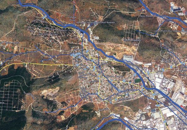 Η ομάδα «Γεωμυθική» μελέτησε τα συχνά πλημμυρικά φαινόμενα της περιοχής και βρήκε τους δρόμους που ακολουθεί το νερό μέσα στην πόλη (με μπλε χρώμα), από τη στιγμή που η κανονική του κοίτη είναι φραγμένη και δεν μπορεί να διοχετεύσει τους εκατοντάδες τόνους νερού που φτάνουν από το όρος Πατέρας.