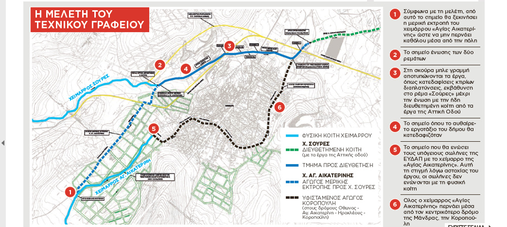 • Για το ρέμα «Αγίας Αικατερίνης», αν και αρκετά μικρότερο ρέμα, οι μηχανικοί έκριναν αναγκαία τη μερική εκτροπή του και σύνδεσή του με το ρέμα «Σούρες», ώστε ο μεγαλύτερος όγκος νερού που κατεβαίνει από το όρος Πατέρας να μη χρειαστεί καν να περάσει μέσα από την πόλη. Σε δεύτερη φάση, για το νερό που θα περνούσε τελικά στο υπόγειο τμήμα του ρέματος, να υπήρχαν τα αναγκαία έργα που θα το ένωναν με τον ήδη υπάρχοντα αγωγό καθώς αυτή τη στιγμή ο χείμαρρος δεν ενώνεται με τους ήδη υπάρχοντες αγωγούς της ΕΥΔΑΠ λόγω αστοχίας κατασκευής.