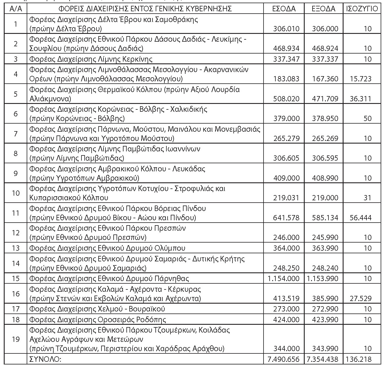 Ο ΦΔ Εθνικού Δρυμού Πάρνηθας εμφανίζει τον υψηλότερο προϋπολογισμό, με τα έσοδα του να ανέρχονται στα 1.154.000 ευρώ, ενώ ο ΦΔ Λιμνοθάλασσας Μεσολογγίου – Ακαρνανικών Ορέων (πρώην Λιμνοθάλασσας Μεσολογγίου) τον χαμηλότερο, με έσοδα 183.083 ευρώ.