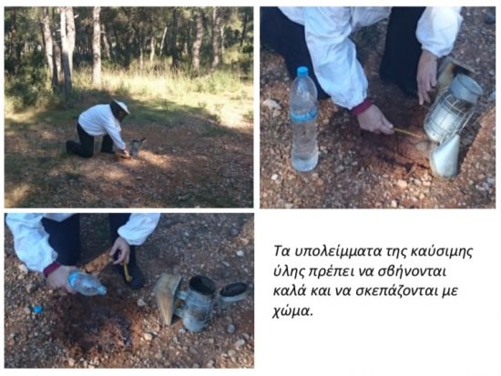 2. σκάψιμο του χώματος, σε σημείο χωρίς χαμηλή βλάστηση, χόρτα ή δέντρα, άδειασμα του καπνιστηριού και σβήσιμο με νερό. Σ’ αυτήν την περίπτωση μπορούμε στο τέλος να σκεπάσουμε με χώμα τα αποκαΐδια.