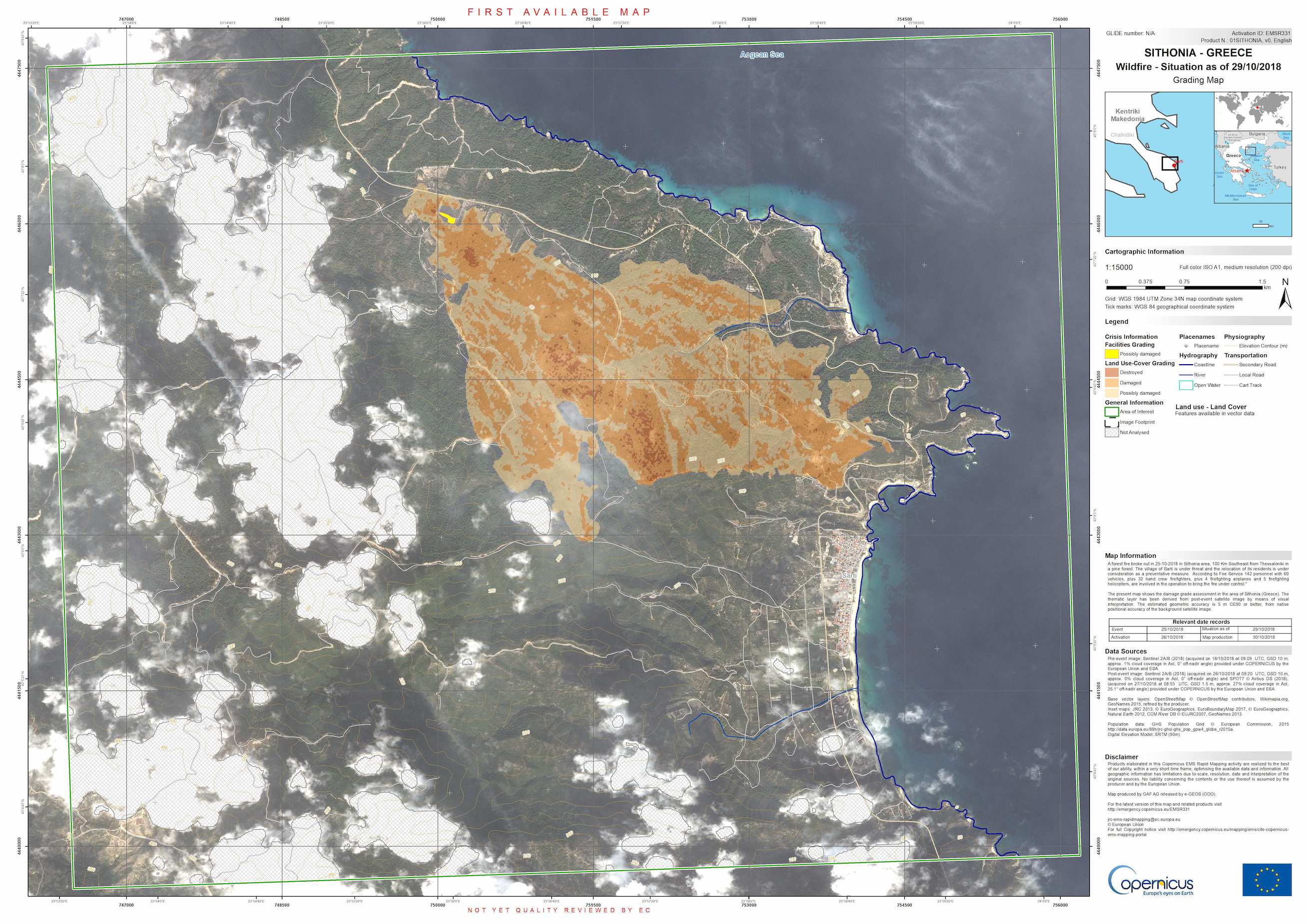 Στο πλαίσιο υποστήριξης του έργου των φορέων που εμπλέκονται στην διαχείριση των συνεπειών που προέκυψαν από την εκδήλωση πυρκαγιών στην περιοχή του Δήμου Σιθωνίας, στις 25 Οκτωβρίου 2018, η Δ/νση Σχεδιασμού και Αντιμετώπισης Εκτάκτων Αναγκών της ΓΓΠΠ, σε εφαρμογή της 8149/16-12-2014 απόφασης του Γενικού Γραμματέα Πολιτικής Προστασίας και κατόπιν σχετικής εντολής του, ζήτησε στις 26-10-2018 την ενεργοποίηση της υπηρεσίας Copernicus/Emergency Management Service – Rapid Mapping της Ευρωπαϊκής Ένωσης, με σκοπό την παραγωγή χαρτογραφικών προϊόντων και δεδομένων για τις πληγείσες περιοχές.