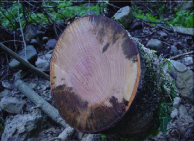 Στα προσβεβλημένα δένδρα που δεν έχουν νεκρωθεί ακόμα, όταν αφαιρεθεί ο φλοιός, παρατηρείται μεταχρωματισμός του ξύλου σε μορφή λωρίδων χρώματος κυανόμαυρου έως καστανόμαυρου.