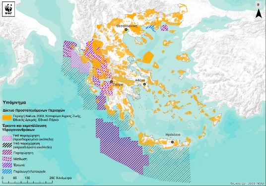 Παρά τους δημόσιους ισχυρισμούς της κυβέρνησης ότι «οι περιοχές Natura θα παραμείνουν άθικτες[1]», οι εργασίες έρευνας και εξόρυξης υδρογονανθράκων επιτρέπονται ακόμα και σε προστατευόμενες περιοχές. Συγκεκριμένα, 56 προστατευόμενες περιοχές[2] βρίσκονται εξ’ ολοκλήρου και 136 προστατευόμενες περιοχές[3] βρίσκονται μερικώς μέσα σε χερσαία και θαλάσσια οικόπεδα εξορύξεων. Το μοναδικό «μέτρο ασφαλείας» που προβλέπεται αφορά τις προστατευόμενες περιοχές στα «οικόπεδα» του Ιονίου, για τις οποίες ισχύει ζώνη αποκλεισμού μόλις 1 χιλιομέτρου, η οποία φυσικά δεν διασφαλίζει την ουσιαστική προστασία σημαντικών περιοχών και οικοτόπων από τις επιβλαβείς εργασίες έρευνας και εξορύξεων. Ο εκκωφαντικός θόρυβος από τις εκρήξεις των σεισμικών ερευνών, η αύξηση των διελεύσεων δεξαμενόπλοιων και η ρύπανση (επιχειρησιακή ή ατυχηματική) δεν γνωρίζουν σύνορα, ιδιαίτερα όταν οι εργασίες αυτές υλοποιούνται στη θάλασσα.
