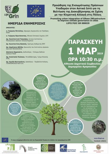 Ημερίδα ενημέρωσης με θέμα: «Προώθηση της ενσωμάτωσης Πράσινων Υποδομών στον Αστικό Ιστό για τη βελτίωση της Διακυβέρνησης σε Σχέση με την Κλιματική Αλλαγή στις Πόλεις», διοργανώνεται στο πλαίσιο του προγράμματος “LIFE 17GIC GR 000029.