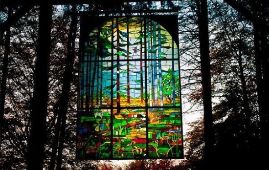 Το φυσικό φως παιχνιδίζει μέσα από τις ψηφίδες αυτού του βιτρό που δημιούργησε ο Κέβιν Άθερτον, προκαλώντας ανάφλεξη των υπέροχων χρωμάτων του και αφήνοντας «πιτσιλιές» στο δασώδες τοπίο. Πισωπατώντας για να το θαυμάσεις, αισθάνεσαι σαν να βρίσκεσαι μέσα σ’ έναν «δασένιο» καθεδρικό ναό, με τοίχους από δέντρα και τρούλο τα πυκνά φυλλώματα.