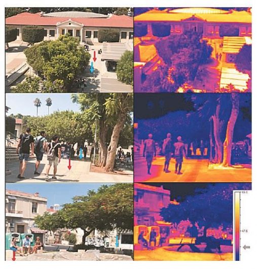 Εικόνα 4. Αριστερά: Συμβατικές απεικονίσεις των χώρων πλησίον πανεπιστημιακών εγκαταστάσεων. Δεξιά: Οι θερμικές απεικονίσεις. Σύμφωνα με τη χρωματική κλίμακα των θερμικών απεικονίσεων, το σκούρο μπλε χρώμα δείχνει τη χαμηλότερη και το κίτρινο-λευκό την ψηλότερη θερμοκρασία. Η θερμοκρασία αέρα κατά τη λήψη ήταν περίπου 40οC (γκρίζο βέλος στη χρωματική κλίμακα). Οι πραγματικές θερμοκρασίες κάποιων υλικών στις φωτογραφίες (π.χ. μεταλλικές κατασκευές) είναι δυνατό να διαφέρουν από τις εικονιζόμενες λόγω ιδιοτήτων τους, που επηρεάζουν σημαντικά την εκπομπή υπέρυθρης ακτινοβολίας.