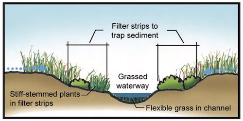 Η ρύπανση των επιφανειακών νερών λόγω της χρήσης ζιζανιοκτόνων και γενικότερα των γεωργικών φαρμάκων σε καλλιεργούμενα χωράφια μπορεί να οφείλεται στην απορροή (run-off) και διάβρωση (erosion) των ψεκασθέντων εδαφών, σε μεταφερόμενα σταγονίδια από το ψεκαστικό νέφος (spray-drift) και σε σημειακές πηγές (point sources). Στις περιπτώσεις ενδεχόμενης ρύπανσης των επιφανειακών νερών λόγω απορροής ή διάβρωσης η εφαρμογή μέτρων μείωσης της επικινδυνότητας της ρύπανσης (risk reduction) είναι επιβεβλημένη. Τα μέτρα αυτά περιλαμβάνουν την εφαρμογή είτε ζωνών εδάφους ( συνήθως με βλάστηση) στην άκρη των χωραφιών (vegetated filter strips, VFSs), είτε παρόχθιων λωρίδων με βλάστηση , δένδρα και θάμνους (riparian buffers), είτε τη χρήση υδάτινων νεροσυρμών βλάστησης (grass water-ways). Η απεικόνιση των μέτρων αυτών παρουσιάζεται στις επισυναπτόμενες φωτογραφίες και σκαριφήματα.