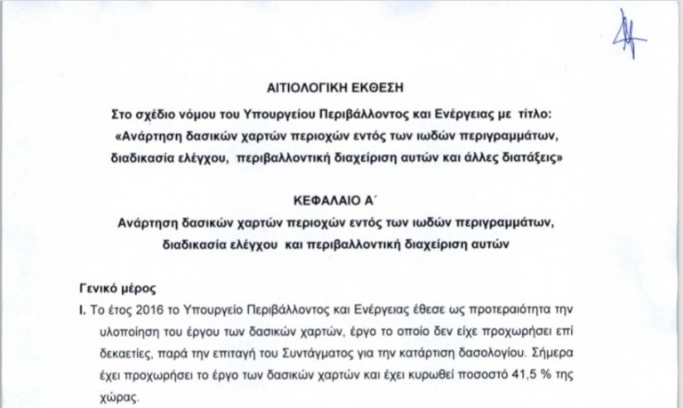 Κατατέθηκε στη Βουλή νομοσχέδιο του υπουργείου Περιβάλλοντος και Ενέργειας με τίτλο «Ανάρτηση δασικών χαρτών περιοχών εντός των ιωδών περιγραμμάτων, διαδικασία ελέγχου, περιβαλλοντική διαχείριση αυτών και άλλες διατάξεις».