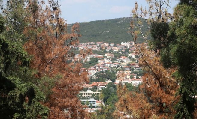 Όπως χαρακτηριστικά δήλωσε η αναπληρώτρια δασάρχης Θεσσαλονίκης Ελένη Αγγελίδου, «τα συμπτώματα δεν ήταν εμφανή μέχρι τα τέλη Απριλίου, υπήρχαν μόνο μεμονωμένα σε κάποια πεύκα. Στις αρχές του Μαΐου όμως εκδηλώθηκε η απότομη ξήρανση» δένδρων που είχαν προσβληθεί από το σκαθάρι. «Από την καταγραφή που έγινε, προέκυψε ότι από τα 25 τμήματα του περιαστικού δάσους, έχουν προσβληθεί τα 10 τμήματα περίπου σε ποσοστό 20-30% της έκτασης, στη βορειοδυτική πλευρά του δάσους» ανέφερε η κ. Αγγελίδου και αυτό υπολογίζεται ότι αντιστοιχεί σε περίπου 3.500 στρέμματα. Πληθυσμοί του σκαθαριού έχουν εντοπιστεί επίσης σε περιοχές της Θέρμης, του Χορτιάτη, του Πανοράματος, του Ωραιόκαστρου και του Σταυρού, αλλά σε αυτές το καταστροφικό τους έργο δεν είναι τόσο μεγάλο.