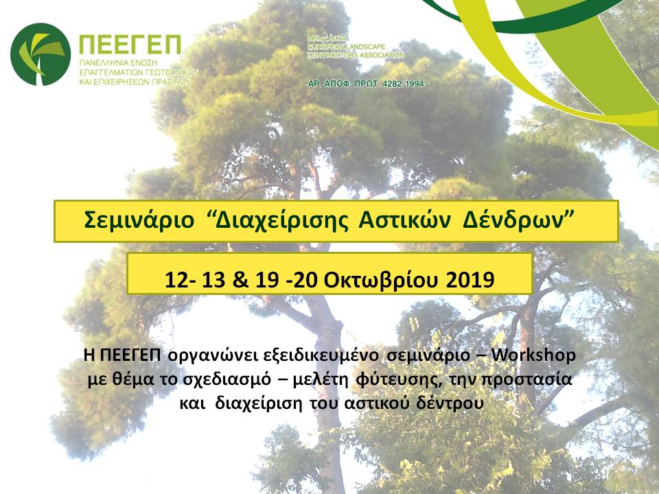 Το ΔΣ της Πανελλήνιας Ένωσης Επαγγελματιών Γεωτεχνικών και Επιχειρήσεων Πρασίνου (ΠΕΕΓΕΠ) εκτιμώντας την εξαιρετική σημασία που έχει για το Αστικό και Περιαστικό Πράσινο το Δένδρο σε όλες τις πτυχές του, από τον σχεδιασμό – μελέτη, την προστασία και διαχείριση του, αλλά ταυτόχρονα ενστερνιζόμενο ένα επίκαιρο αίτημα επιστημόνων επαγγελματιών που εμπλέκονται με το Αστικό Δένδρο, μελών της ΠΕΕΓΕΠ, αποφάσισε στην τελευταία του συνεδρία την διοργάνωση εξειδικευμένου σεμιναρίου για το Αστικό Δένδρο.
