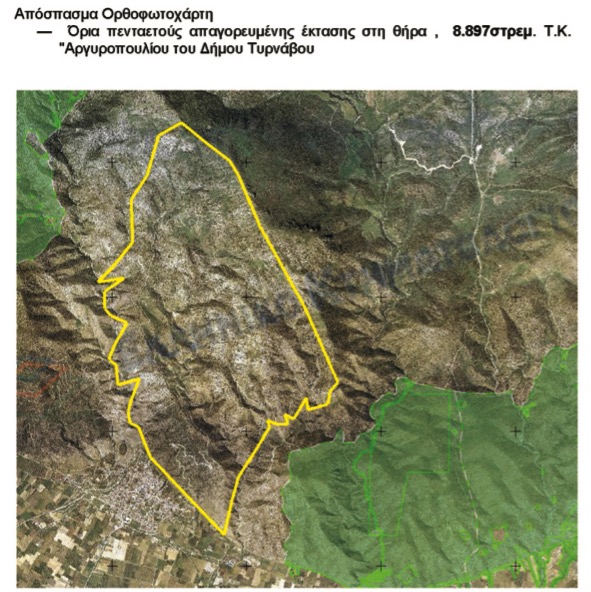 Για τα επόμενα πέντε χρόνια, ήτοι από 1-8-2019 μέχρι 31-7-2024, συνεχίζεται η απαγόρευση θήρας όλων των θηραμάτων σε έκταση 8.897 στρεμ. στη Τ.Κ. Αργυροπουλίου του Δήμου Τυρνάβου, όπως απεικονίζεται στο απόσπασμα ορθοφωτοχάρτη που συνοδεύει τη σχετική απόφαση της Αποκεντρωμένης Διοίκησης Θεσσαλίας – Στερεάς Ελλάδας.