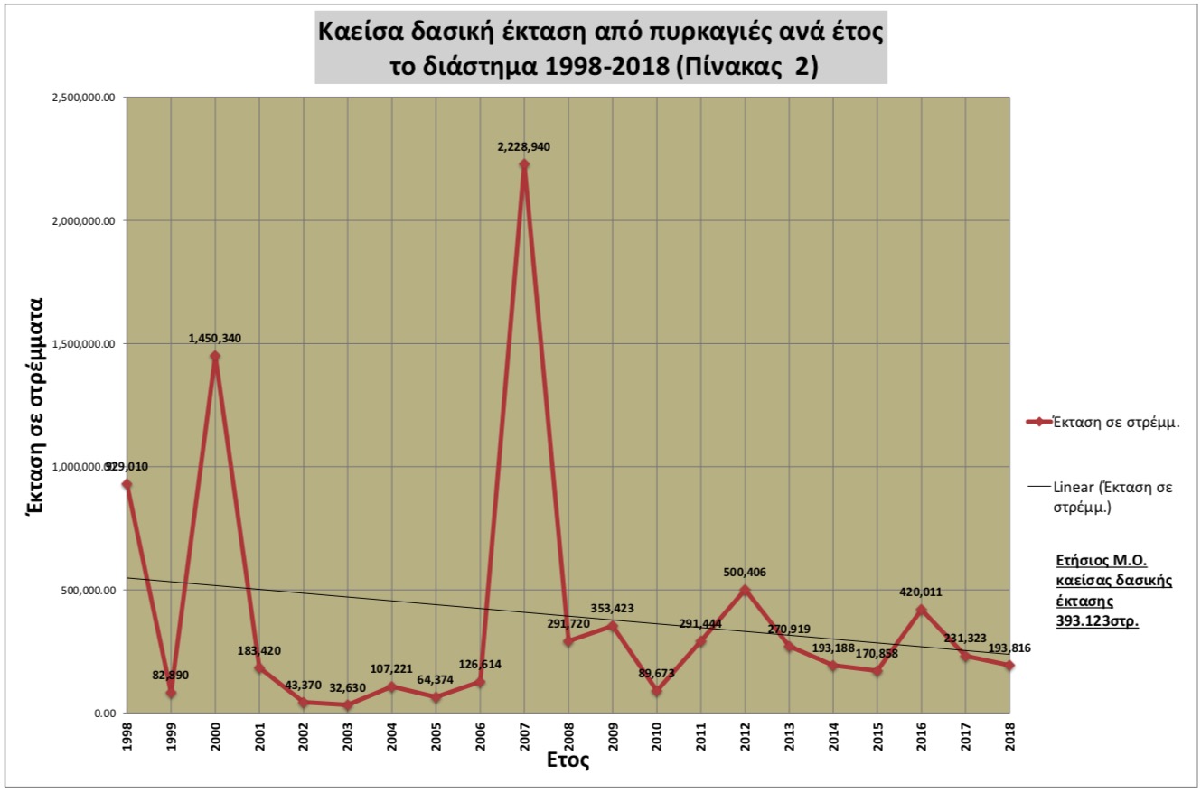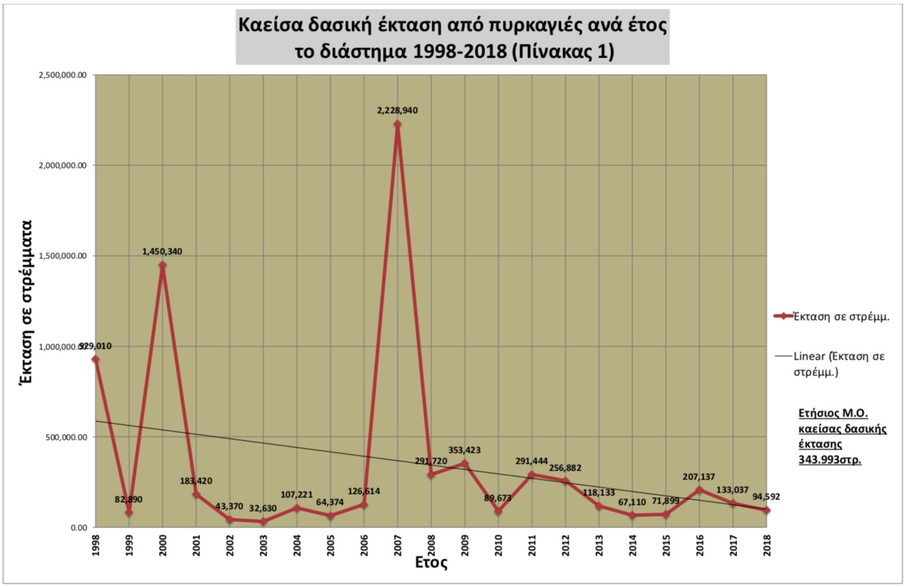 Το αν το γεγονός αυτό οφείλεται αποκλειστικά στην ικανότητα του Πυροσβεστικού Σώματος, ή στην διάθεση περισσοτέρων κονδυλίων, από όσα δαπανούνταν το χρονικό διάστημα που την δασοπυρόσβεση είχε η Δασική Υπηρεσία, δεν αλλάζει την ουσία. Ότι δηλαδή έχουμε σαφή μείωση της μέσης ετήσιας καμένης δασικής έκτασης από το 1998 μέχρι το 2017-2018.