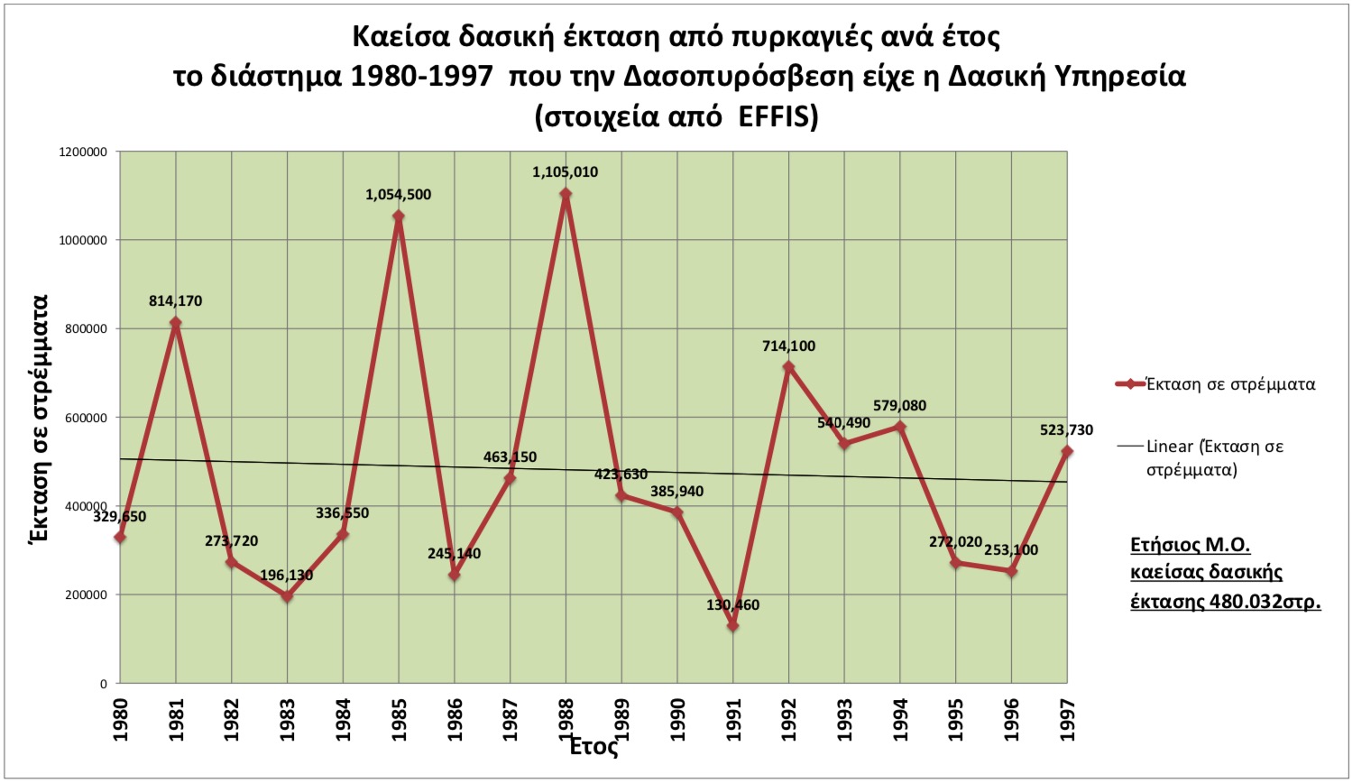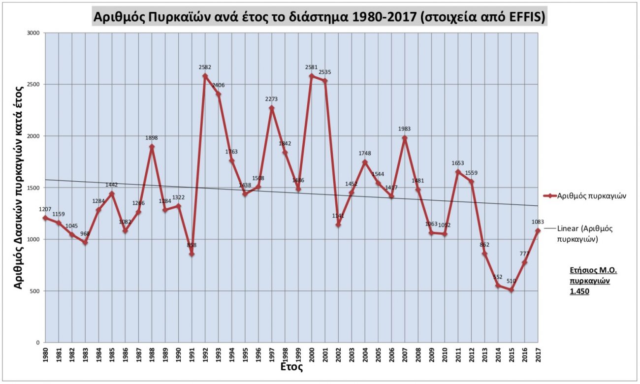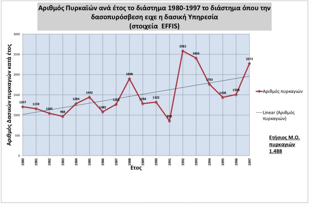 Επειδή από την ίδρυση και λειτουργία του EFFIS, αυτός θεωρείται τόσο από την Κεντρική Δασική Υπηρεσία, όσο και από την Εθνική Στατιστική Αρχή και τα άλλα θεσμικά όργανα της Ε.Ε., ως ο μόνο αξιόπιστος οργανισμός τα στοιχεία του οποίου χρησιμοποιούνται για την χάραξη πολιτικών και λήψη αποφάσεων, οδηγηθήκαμε στην σύγκριση των διαστημάτων 1980-1997 (Διάστημα που η δασοπυρόσβεση ανήκε στην αρμοδιότητα της Δασικής Υπηρεσίας) και 1998-2017 που η ευθύνη δασοπυρόσβεσης πέρασε στο Πυροσβεστικό Σώμα.
