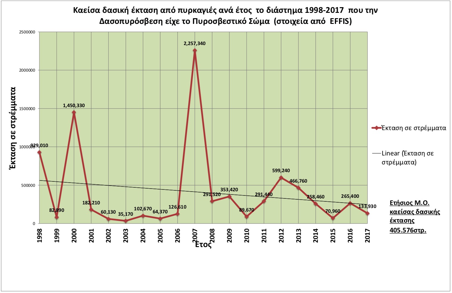 Από τα ανωτέρω γίνεται αντιληπτό, ότι το διάστημα 1998-2017 με βάση τα στοιχεία του EFFIS, που η ευθύνη δασοπυρόσβεσης ανήκει στο Πυροσβεστικό Σώμα, η μέση ετήσια καείσα δασική έκταση είναι μικρότερη της καείσας, κατά την περίοδο που την ευθύνη της δασοπυρόσβεσης είχε η Δασική Υπηρεσία.