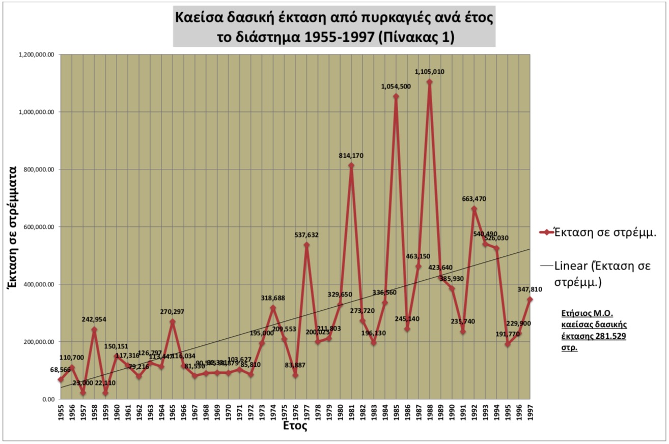 Το συμπέρασμα αυτό βγαίνει διότι συνυπολογίζονται τα έτη 1955-1973 όπου οι πυρκαγιές ήταν λιγότερες και έκαιγαν γενικά μικρότερη έκταση. Την διαπίστωση αυτή αποτύπωσαν διάφοροι ερευνητές, μεταξύ των οποίων και ο κ. Καϊλίδης. Α ό το 1974 έχουμε δραματική αύξηση του αριθμού και της καιόμενης κατ’ έτος έκτασης.