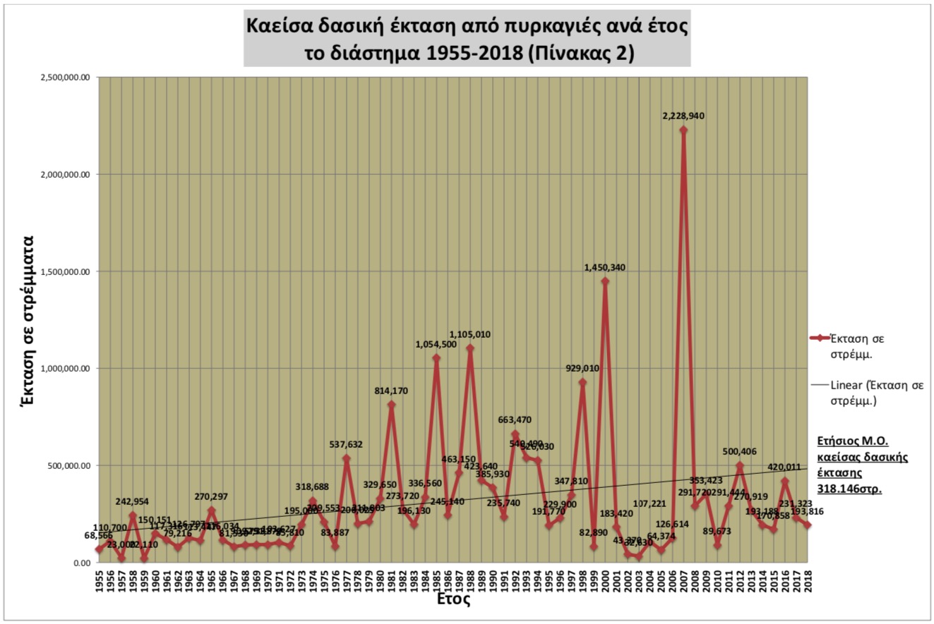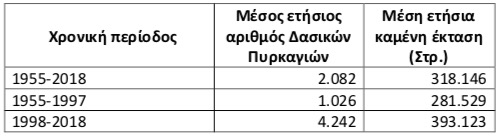 Οι ετήσιοι μέσοι όρων των αριθμών των Δασικών πυρκαγιών, και την καμένης δασικής έκτασης, στο σύνολο του διαστήματος 1955-2018, αλλά και για τις περιόδους α) 1955-1997 (Όταν την ευθύνη της Δασοπυρόσβεσης είχε η Δασική Υπηρεσία) και β) 1998-2018 (Που την ευθύνη Δασοπυρόσβεσης έχει το Πυροσβεστικό Σώμα), εμφανίζονται στον παρακάτω πίνακα.