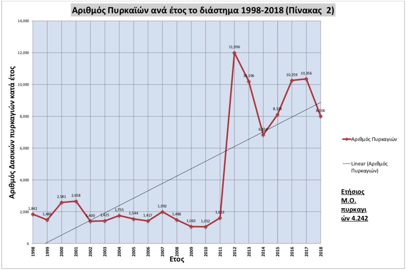 Πίνακας 2. (Τα στοιχεία των ετών 2012-2018, αφορούν όλες τις κατηγορίες των στατιστικών που το Π.Σ. θεωρεί Δασικές Πυρκαγιές)