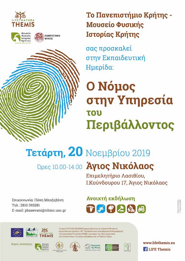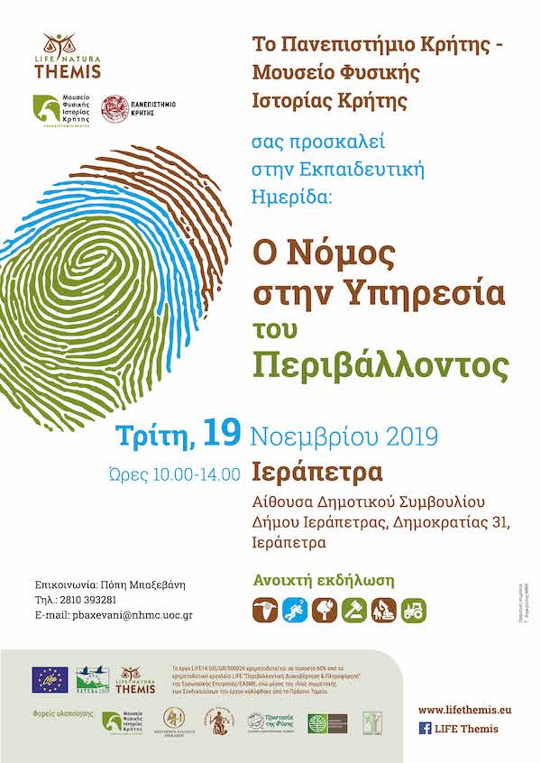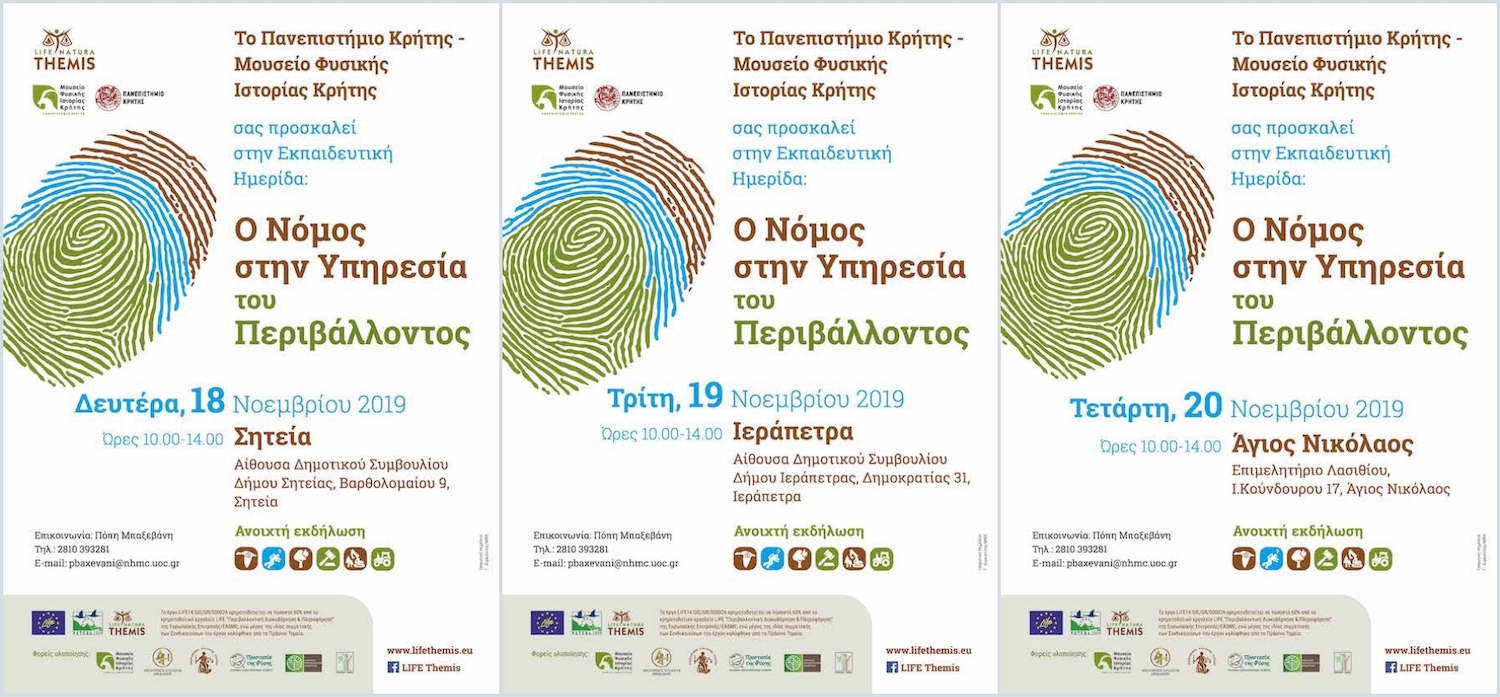 Το Πανεπιστήμιο Κρήτης-Μουσείο Φυσικής Ιστορίας Κρήτης (ΠΚ-ΜΦΙΚ) και οι εταίροι του έργου LIFE Natura Themis διοργανώνουν σειρά εκπαιδευτικών-ενημερωτικών ημερίδων σε όλη την Κρήτη, για στελέχη/υπαλλήλους του δημόσιου και ευρύτερου δημόσιου τομέα, που ασκούν προανακριτικό έργο ή εργάζονται σε θέσεις στις οποίες απαιτείται η εμπλοκή με την εφαρμογή της περιβαλλοντικής νομοθεσίας, και ενδιαφέρονται να τις παρακολουθήσουν.