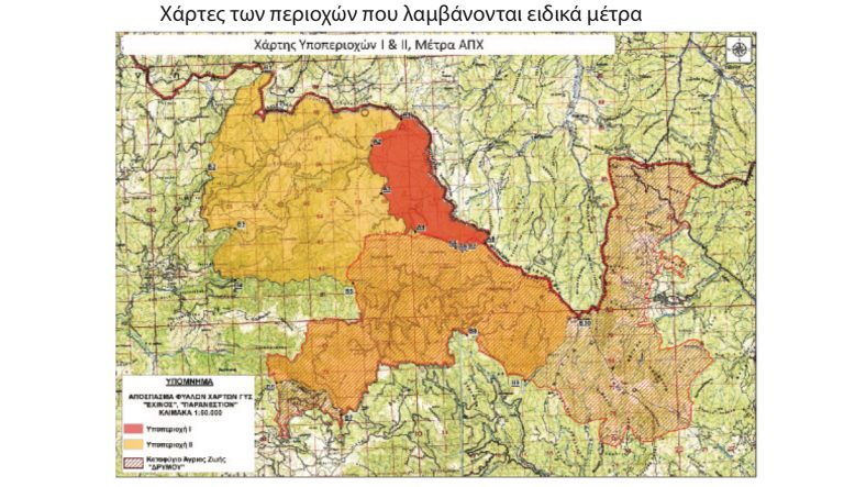 Μεταξύ των μέτρων που προβλέπει η ΚΥΑ για τις συγκεκριμένες περιοχές (Υποπεριοχή I και ΙΙ) είναι και η απαγόρευση οποιασδήποτε ανθρώπινης δραστηριότητας, συμπεριλαμβανομένων της θήρας –πλην της θήρας αγριόχοιρου-, της διαχείρισης και εκμετάλλευσης των δασών, του αγροτουρισμού και της βόσκησης εκτρεφόμενων ειδών (βοοειδή, αιγοπρόβατα). Η θήρα του αγριόχοιρου επεκτείνεται και διενεργείται όλες τις ημέρες της εβδομάδας και χωρίς περιορισμούς στην κάρπωση, με σκοπό την μείωση του πληθυσμού του αγριόχοιρου.