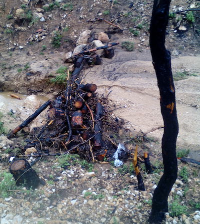 Οι παρακάτω φωτογραφίες έχουν ληφθεί μετά την έντονη βροχόπτωση που προκάλεσε μεγάλα προβλήματα και καταστροφές στη περιοχή της Κινέτας (κακοκαιρία Γηρυόνης). Σύμφωνα με τα στοιχεία του Εθνικού Αστεροσκοπείου Αθηνών στην ευρύτερη περιοχή το ύψος της βροχής που έπεσε μέσα σε λίγες ώρες έφτασε τα 205,8 χιλιοστά, δηλαδή πάνω από 200 τόνοι νερού ανά στρέμμα! Παρά τη ραγδαιότητα της βροχόπτωσης, όπως φαίνεται και στις φωτογραφίες, οι κορμοί των δένδρων που συγκροτούν τα κορμοδέματα παραμένουν στη θέση τους, συγκρατώντας, στο μέτρο του δυνατού, έδαφος και σπόρους στις καμένες πλαγιές. Τα κορμοφράγματα έχουν συγκρατήσει μεγάλες ποσότητες φερτών υλικών χωρίς σημαντικές ζημιές. Αυτή η ποσότητα των φερτών υλικών, σε διαφορετική περίπτωση, παρασύρεται και μέσω των ρεμάτων καταλήγει στη θάλασσα.
