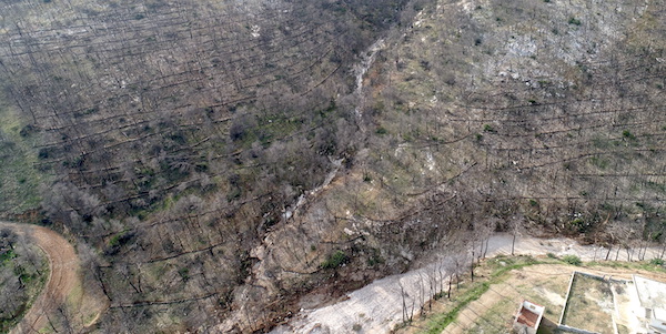 Οι παρακάτω φωτογραφίες έχουν ληφθεί μετά την έντονη βροχόπτωση που προκάλεσε μεγάλα προβλήματα και καταστροφές στη περιοχή της Κινέτας (κακοκαιρία Γηρυόνης). Σύμφωνα με τα στοιχεία του Εθνικού Αστεροσκοπείου Αθηνών στην ευρύτερη περιοχή το ύψος της βροχής που έπεσε μέσα σε λίγες ώρες έφτασε τα 205,8 χιλιοστά, δηλαδή πάνω από 200 τόνοι νερού ανά στρέμμα! Παρά τη ραγδαιότητα της βροχόπτωσης, όπως φαίνεται και στις φωτογραφίες, οι κορμοί των δένδρων που συγκροτούν τα κορμοδέματα παραμένουν στη θέση τους, συγκρατώντας, στο μέτρο του δυνατού, έδαφος και σπόρους στις καμένες πλαγιές. Τα κορμοφράγματα έχουν συγκρατήσει μεγάλες ποσότητες φερτών υλικών χωρίς σημαντικές ζημιές. Αυτή η ποσότητα των φερτών υλικών, σε διαφορετική περίπτωση, παρασύρεται και μέσω των ρεμάτων καταλήγει στη θάλασσα.