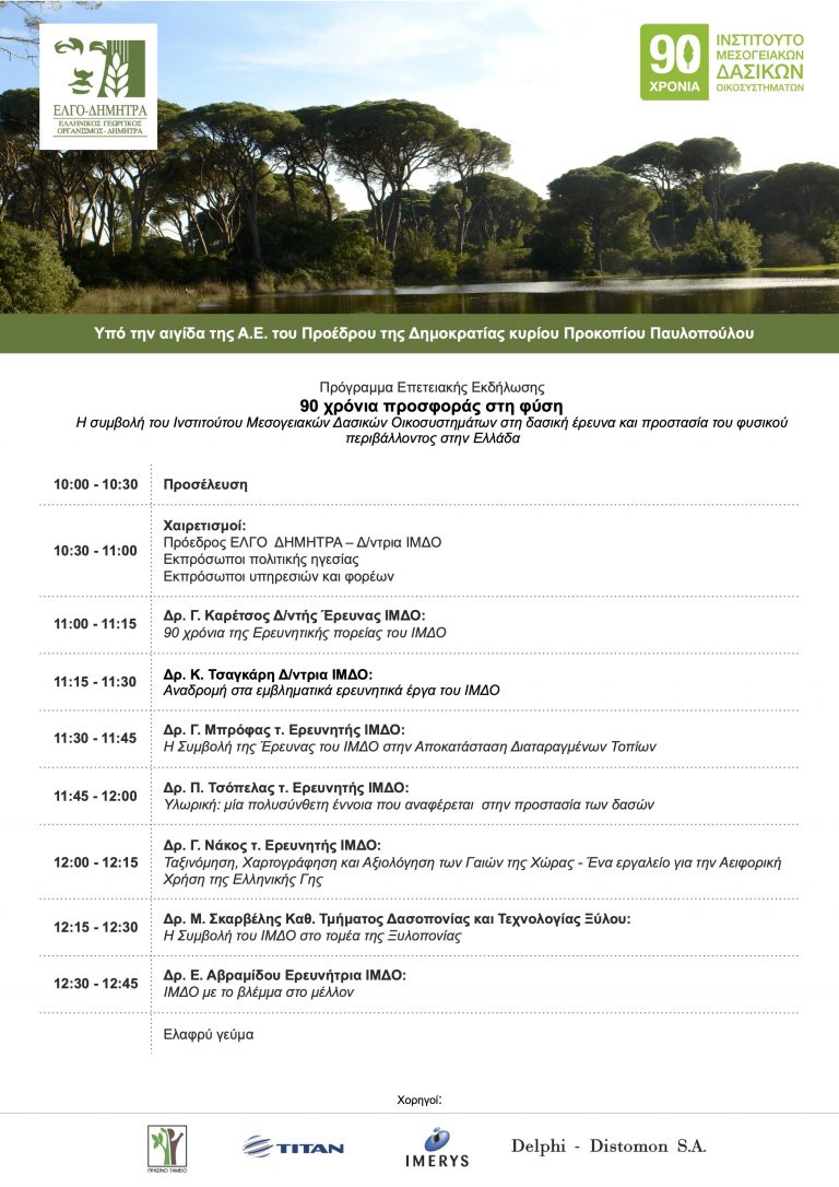 Η Διοίκηση του ΕΛΓΟ-ΔΗΜΗΤΡΑ και η Διεύθυνση του Ινστιτούτου Μεσογειακών Δασικών Οικοσυστημάτων (ΙΜΔΟ), με αφορμή τη συμπλήρωση 90 χρόνων από την ίδρυση του ΙΜΔΟ, διοργανώνουν εκδήλωση με θέμα: