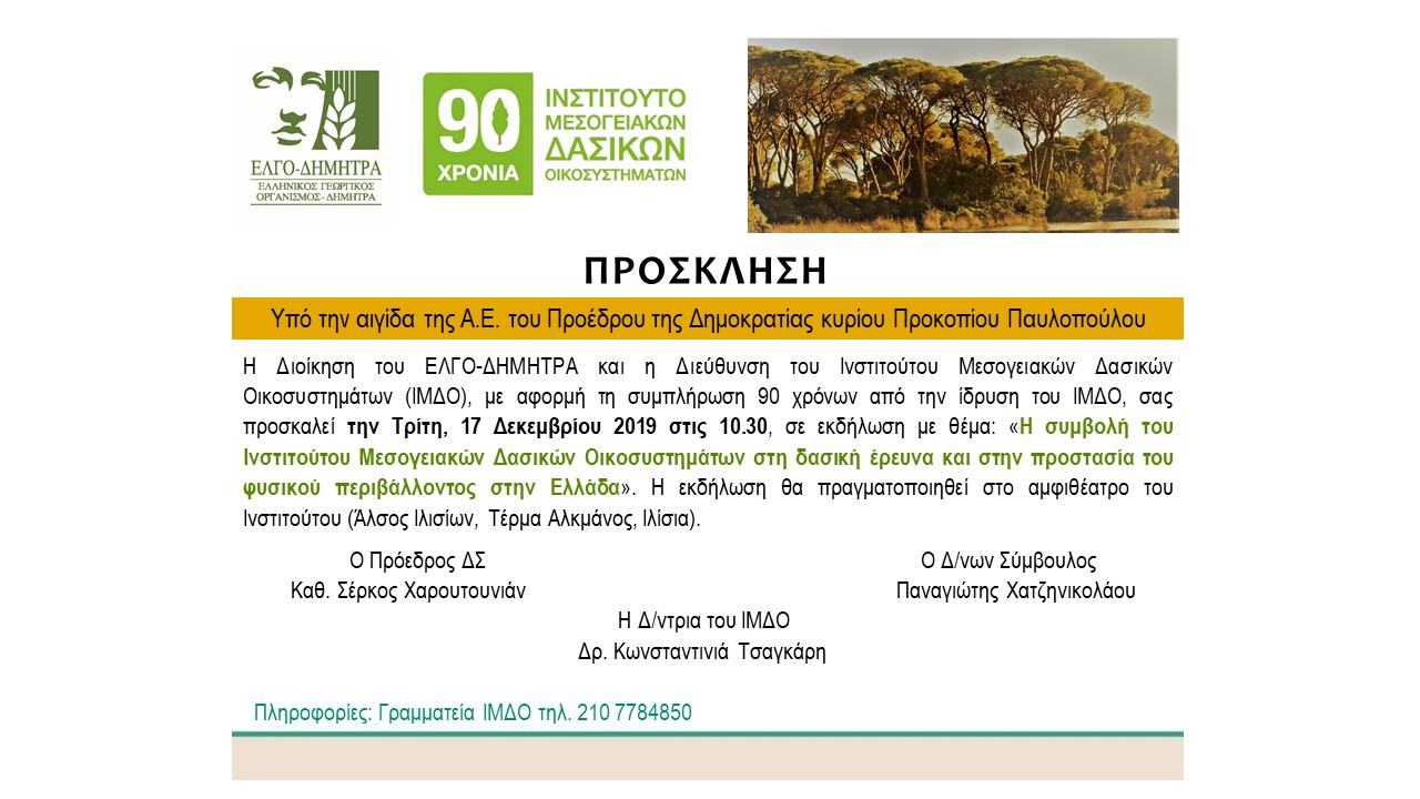 Η Διοίκηση του ΕΛΓΟ-ΔΗΜΗΤΡΑ και η Διεύθυνση του Ινστιτούτου Μεσογειακών Δασικών Οικοσυστημάτων (ΙΜΔΟ), με αφορμή τη συμπλήρωση 90 χρόνων από την ίδρυση του ΙΜΔΟ, διοργανώνουν εκδήλωση με θέμα: