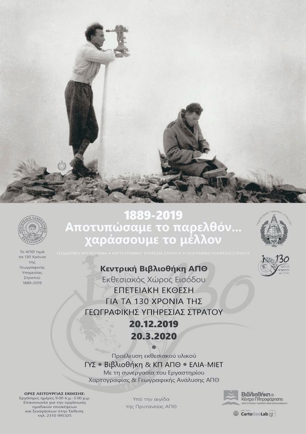 Η έκθεση «1889-2019: Αποτυπώσαμε το παρελθόν, χαράσσουμε το μέλλον» εγκαινιάστηκε από τον Πρύτανη του Αριστοτέλειου Πανεπιστημίου Θεσσαλονίκης, Καθηγητή Νικόλαο Γ. Παπαϊωάννου, την Παρασκευή 20 Δεκεμβρίου 2019, στις 10:00, στον εκθεσιακό χώρο που βρίσκεται στην είσοδο της Κεντρικής Βιβλιοθήκης του ΑΠΘ. Χαιρετισμό στα εγκαίνια απεύθυναν ο Πρύτανης του ΑΠΘ, Καθηγητής Νικόλαος Γ. Παπαϊωάννου, ο Διευθυντής Γεωγραφικού του ΓΕΣ, Ταξίαρχος Χρήστος Νινιός και ο Διοικητής της ΓΥΣ, Συνταγματάρχης Βαρδής Καγιαδάκης, οι οποίοι συνέβαλαν στην ολοκλήρωση και επιτυχία της κυρίως έκθεσης στο Πολεμικό Μουσείο Αθηνών.