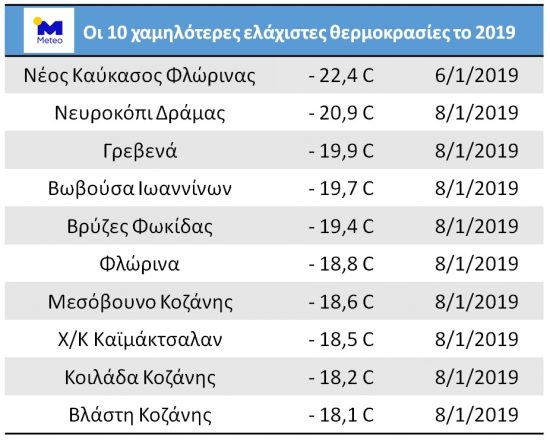 Οι υψηλότερες μέγιστες θερμοκρασίες το 2019 σημειώθηκαν στη Χάλκη Λάρισας (41,9 βαθμοί στις 8/7), στη Λάρισα (41,6 στις 9/7) και στο Θεολόγο Φθιώτιδας (41,4 στις 3/8). Οι χαμηλότερες ελάχιστες θερμοκρασίες καταγράφηκαν σε Νέο Καύκασο Φλώρινας (μείον 22,5 στις 6/1), Νευροκόπι (μείον 20,9 στις 8/1) και Γρεβενά (μείον 19,9 στις 8/1).