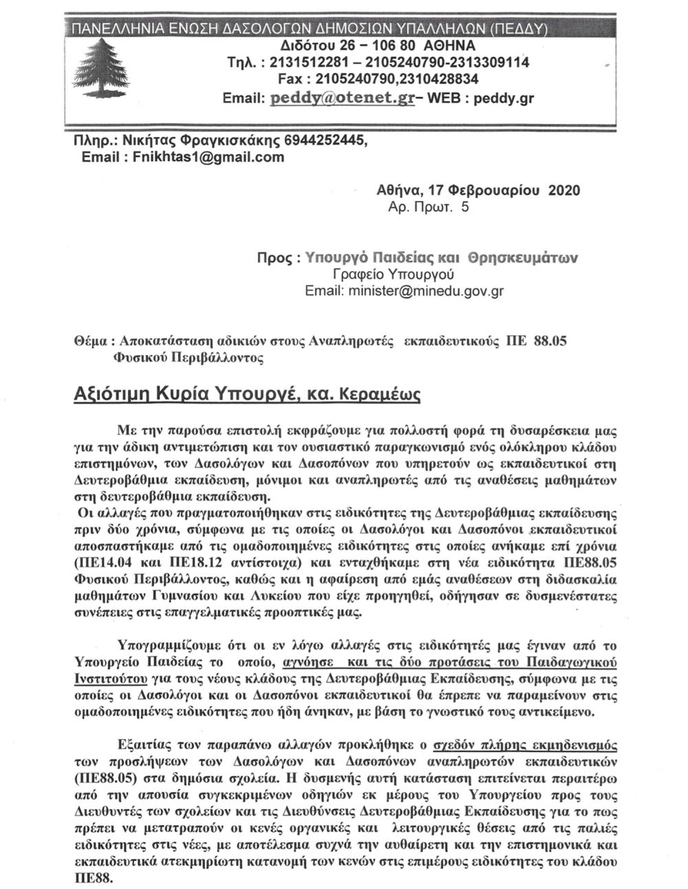 Όπως τονίζει η ΠΕΔΔΥ, εξαιτίας των αλλαγών που πραγματοποιήθηκαν στις ειδικότητες της Δευτεροβάθμιας εκπαίδευσης πριν δύο χρόνια, προκλήθηκε o σχεδόν πλήρης εκμηδενισμός των προσλήψεων των Δασολόγων και Δασοπόνων αναπληρωτών εκπαιδευτικών (ΠΕ88.Ο5) στα δημόσια σχολεία. Ενδεικτικά σημειώνει ότι στη σχολική χρονιά 2018-19 πραγματοποιήθηκαν μόνο 4 προσλήψεις αναπληρωτών εκπαιδευτικών ΠΕ88.Ο5, ενώ την τρέχουσα σχολική χρονιά οι προσλήψεις ανέρχονται ως τώρα σε μόλις 3.