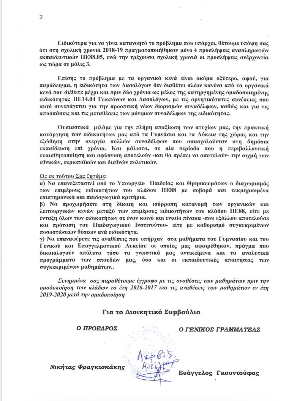 - Να επαναφέρει τις αναθέσεις που υπήρχαν στα μαθήματα του Γυμνασίου και του Γενικού και Επαγγελματικού Λυκείου οι οποίες αφαιρέθηκαν, πράγμα που δικαιολογούν απόλυτα τόσο τα γνωστικά αντικείμενα των δασολόγων-Δασοπόνων και τα αναλυτικά προγράμματα των σπουδών τους, όσο και οι εκπαιδευτικές απαιτήσεις των συγκεκριμένων μαθημάτων.