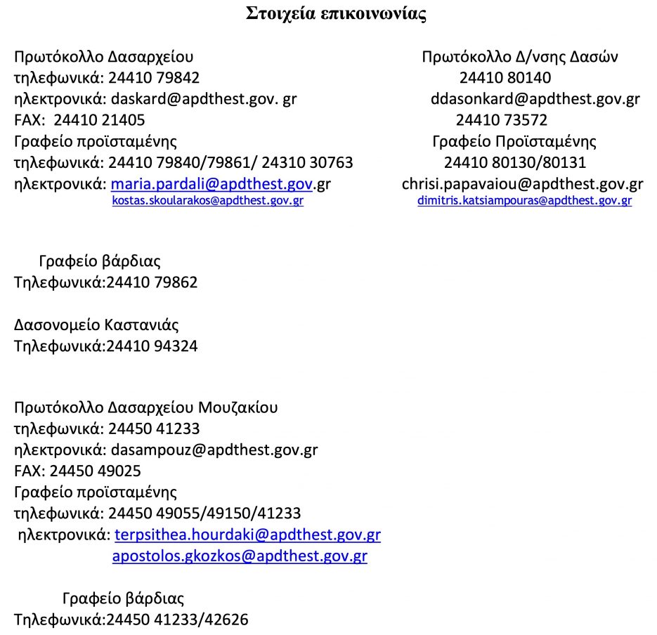 Οι Δασικές Υπηρεσίες Π.Ε.Καρδίτσας μετά από σχετική ανακοίνωση του Συντονιστή της Αποκεντρωμένης Διοίκησης Θεσσαλίας-Στ.Ελλάδας, λαμβάνοντας υπόψη α) τη σύνθεση του υπαλληλικού προσωπικού β) τις τυχόν περιπτώσεις ευπαθών ομάδων και γ) τις άδειες ειδικού σκοπού, με στόχο την συμβολή όλων μας στην εθνική πλέον προσπάθεια για τον περιορισμό της διασποράς του κορωνοϊού COVID-19, ανακοινώνουν ότι αναστέλλουν μέχρι νεοτέρας την αυτοπρόσωπη εξυπηρέτηση πολιτών στην υπηρεσία, ενώ οι συναλλασσόμενοι μπορούν να διατυπώνουν τα αιτήματά τους τηλεφωνικώς, ταχυδρομικώς ή μέσω ηλεκτρονικού ταχυδρομείου. Σε περίπτωση που πρόκειται για κατεπείγουσα περίπτωση, η επίσκεψη στην Υπηρεσία θα γίνεται μόνο κατόπιν ραντεβού.