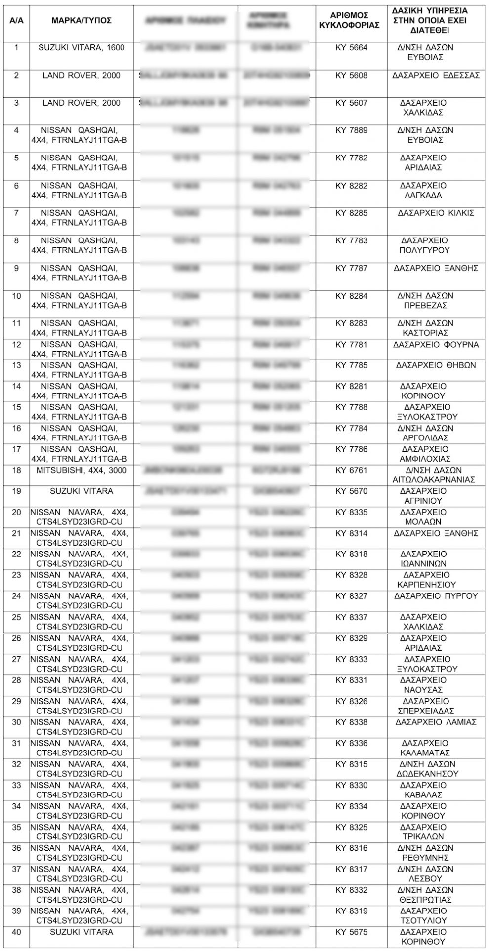 Παρατείνεται για ακόμα ένα (1) έτος η διάθεση προς χρήση σε δασικές υπηρεσίες των αποκεντρωμένων διοικήσεων της χώρας 40 αυτοκινήτων (απαριθμούνται πίνακα που ακολουθεί).