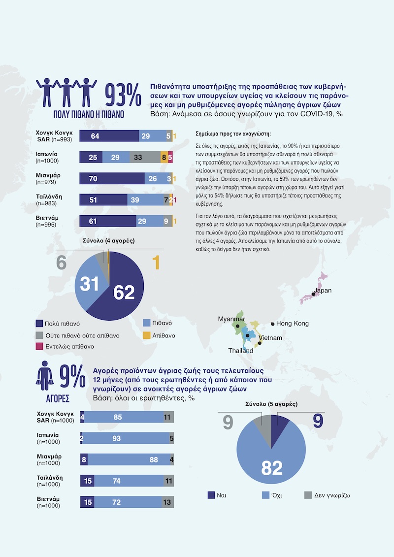 Αντίστοιχα, 8 στους 10 συμμετέχοντες και στις πέντε χώρες δήλωσαν πως θα ανησυχούν πολύ έως πάρα πολύ για την εμφάνιση μελλοντικών εξάρσεων σε περίπτωση που δεν ληφθούν μέτρα για την παύση της λειτουργίας αυτών των αγορών, ενώ στην ερώτηση σχετικά με το πώς θα υποστήριζαν πρωτοβουλίες για το κλείσιμο των αγορών, το 55% απάντησε πως θα σταματούσε να καταναλώνει άγρια ζώα, το 53% θα προσπαθούσε να πείσει και άλλους να μην αγοράζουν/ καταναλώνουν τέτοια είδη, το 50% θα υποστήριζε σχετικές δράσεις επικοινωνίας για το κλείσιμο των αγορών και το 49% θα βοηθούσε στη διάδοση πληροφοριών σχετικά με την αναγκαία προστασία των ζώων.