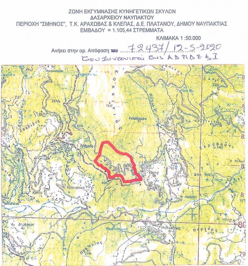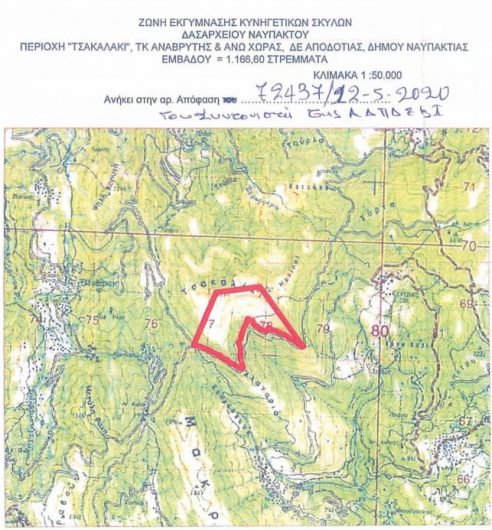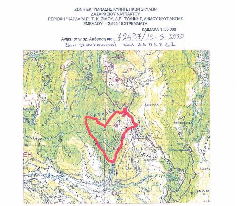 τα όρια των οποίων περιγράφονται αναλυτικά στην σχετική απόφαση και απεικονίζονται στα αποσπάσματα χαρτών ΓΥΣ που την συνοδεύουν, επιτρέπεται καθ’ όλο το έτος η εκγύμναση κυνηγετικών σκύλων που συνοδεύονται από κυνηγούς ή κυναγωγούς, χωρίς να φέρουν κυνηγετικό όπλο και υπό την τήρηση συγκεκριμένων όρων και περιορισμών.