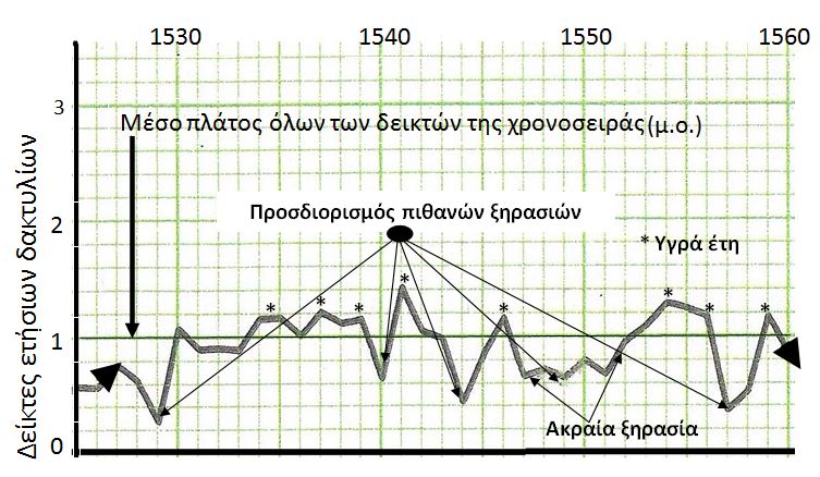 Η προσέγγιση προσδιορισμού των ανωτέρω φαινομένων βασίζεται στις δυνατότητες της παλαιοκλιματολογίας. Ο επιστημονικός αυτός κλάδος ασχολείται με τη μελέτη των αλλαγών του κλίματος του πλανήτη μας από την περίοδο, πριν την έναρξη λειτουργίας των μετεωρολογικών οργάνων ως και το απώτερο παρελθόν της. Ο συγκεκριμένος κλάδος αξιοποιεί μαρτυρίες που υπάρχουν σε «φυσικά μέσα» ή «φυσικά αρχεία» και σε αυτά, εκτός των άλλων, περιλαμβάνονται και οι ετήσιοι δακτύλιοι δασικών δένδρων (έμμεσες πληροφορίες – proxy data). Κατά συνέπεια, με τη χρήση χρονοσειρών δεικτών ετήσιων δακτυλίων είναι εφικτός ο προσδιορισμός ακραίων ξηρασιών του παρελθόντος.