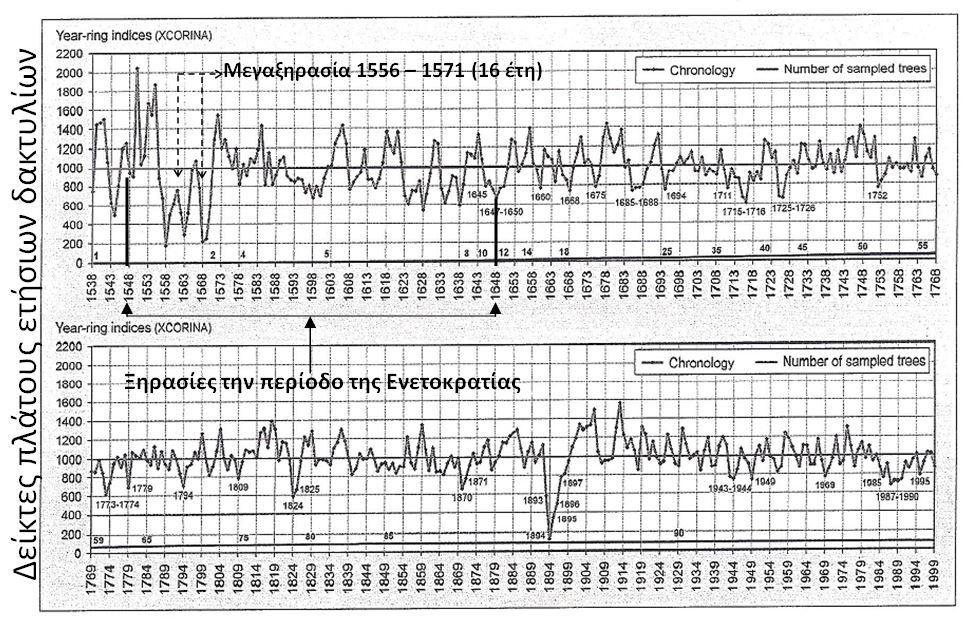 3 16ος 1560 – 1566 7 Ισχυρότατη ακραία ξηρασία τουλάχιστον από τη νότια Ελλάδα ως την Κρήτη, με κοινωνικοοικονομικές επιπτώσεις. Προσδιορίσθηκε ως 16ετής, αλλά επαληθεύθηκε ως 7ετής και αναγκαστικά έγιναν αποδεκτά τα 7 κοινά τους έτη.