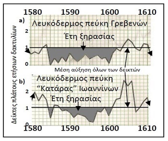 Ο αριθμός των 9 ακραίων ξηρασιών είναι σχετικά μικρός και αυτό οφείλεται στις δυσκολίες επαλήθευσης όλων όσων είχαν προσδιορισθεί από τις 3 χρονοσειρές δεικτών ετήσιων δακτυλίων. Η μεγάλη όμως διάρκεια και συχνότητα εκδήλωσης αυτών συμπίπτουν, σύμφωνα με διεθνείς βιβλιογραφικές αναφορές, με τα ίδια χαρακτηριστικά των αντίστοιχων εκείνων φαινομένων που εκδηλώθηκαν στις ΝΔ Πολιτείες της Αμερικής κατά τη ζεστή περίοδο του Μεσαίωνα. Αντιπροσωπευτική και γνήσια ακραία ξηρασία των παραπάνω 9, είναι για τη χώρα μας εκείνη της περιόδου (1585–1600).