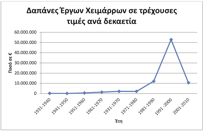 Διάγραμμα δαπανών για υδρονομικά έργα των Δασικών Υπηρεσιών ανά χρονική περίοδο (δαπάνες σε ΕΥΡΩ ανοιγμένες σε σημερινές τιμές-Πηγή ΔΑΣΙΚΗ ΥΠΗΡΕΣΙΑ)
