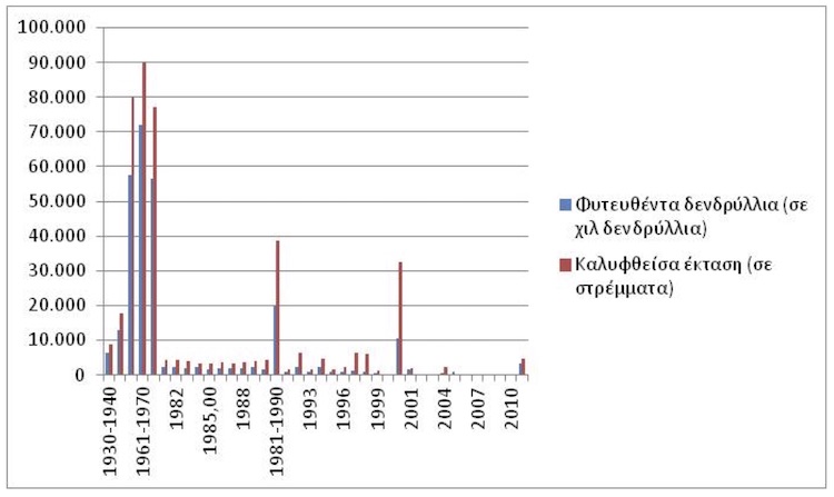 Στο διάγραμμα που ακολουθεί παρουσιάζονται συνοπτικά οι απίστευτα τεράστιες φυτεύσεις που πραγματοποιήθηκαν από τις Δασικές Υπηρεσίες από το 1930 μέχρι και το 2010. Παρατηρούμε ότι πρακτικά δεν έγιναν καθόλου φυτεύσεις από το 2001 κι έπειτα μετά την κάθετη πτώση και των ελάχιστων χρημάτων που δαπανούνταν. Μάλιστα από το 2005 κι έπειτα μηδενίστηκαν ή περιορίστηκαν σε ελάχιστα τμήματα στα όρια πόλεων, χωριών κλπ.