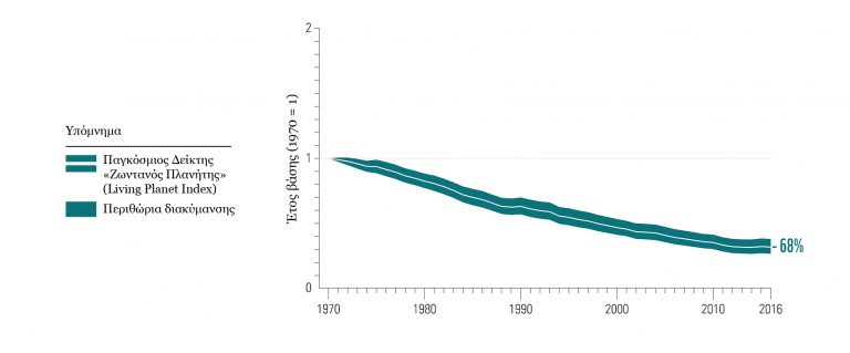 Ο «Ζωντανός Πλανήτης 2020», η 13η έκδοση της έκθεσης – ορόσημο του WWF παγκοσμίως, παρουσιάζει μία συνολική εικόνα της κατάστασης του φυσικού μας κόσμου μέσα από τον Δείκτη LPI (Living Planet Index), όπως προσδιορίστηκε από τη Ζωολογική Εταιρεία του Λονδίνου (ZSL-Zoological Society of London). Ο Δείκτης αποτυπώνει την τάση για σχεδόν 21.000 πληθυσμούς περισσότερων από 4.000 ειδών σπονδυλόζωων στο διάστημα μεταξύ 1970 και 2016, με τη συμβολή πάνω από 125 ειδικών από όλο τον κόσμο. Συγκεκριμένα, μέσα σε αυτά τα 46 χρόνια, καταγράφεται μείωση 68% κατά μέσο όρο στο μέγεθος των πληθυσμών θηλαστικών, πτηνών, αμφιβίων, ερπετών και ψαριών διεθνώς.